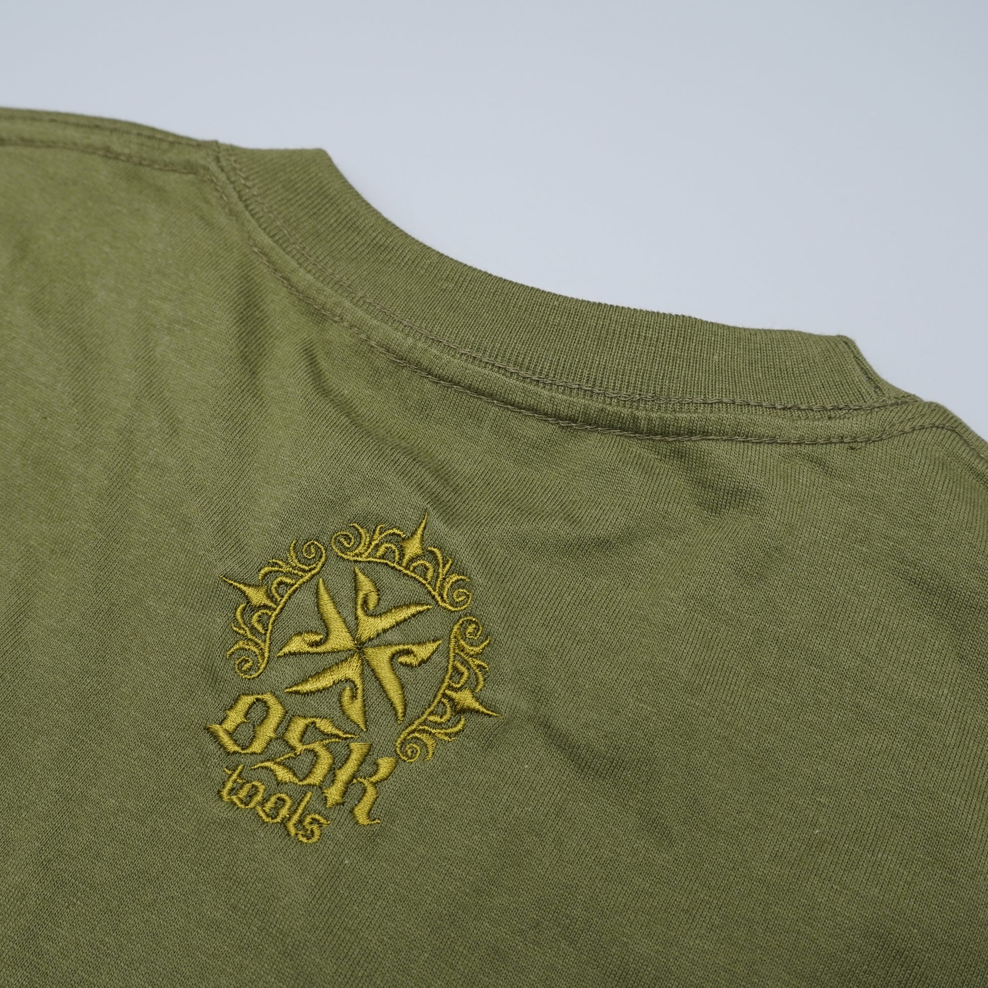 A chest pocket adds practical character, while the embroidered OSK logo at the back neck offers a subtle branding detail—visible only when noticed, never overstated. This balance of function and restraint reflects OSK’s approach to modern workwear essentials.